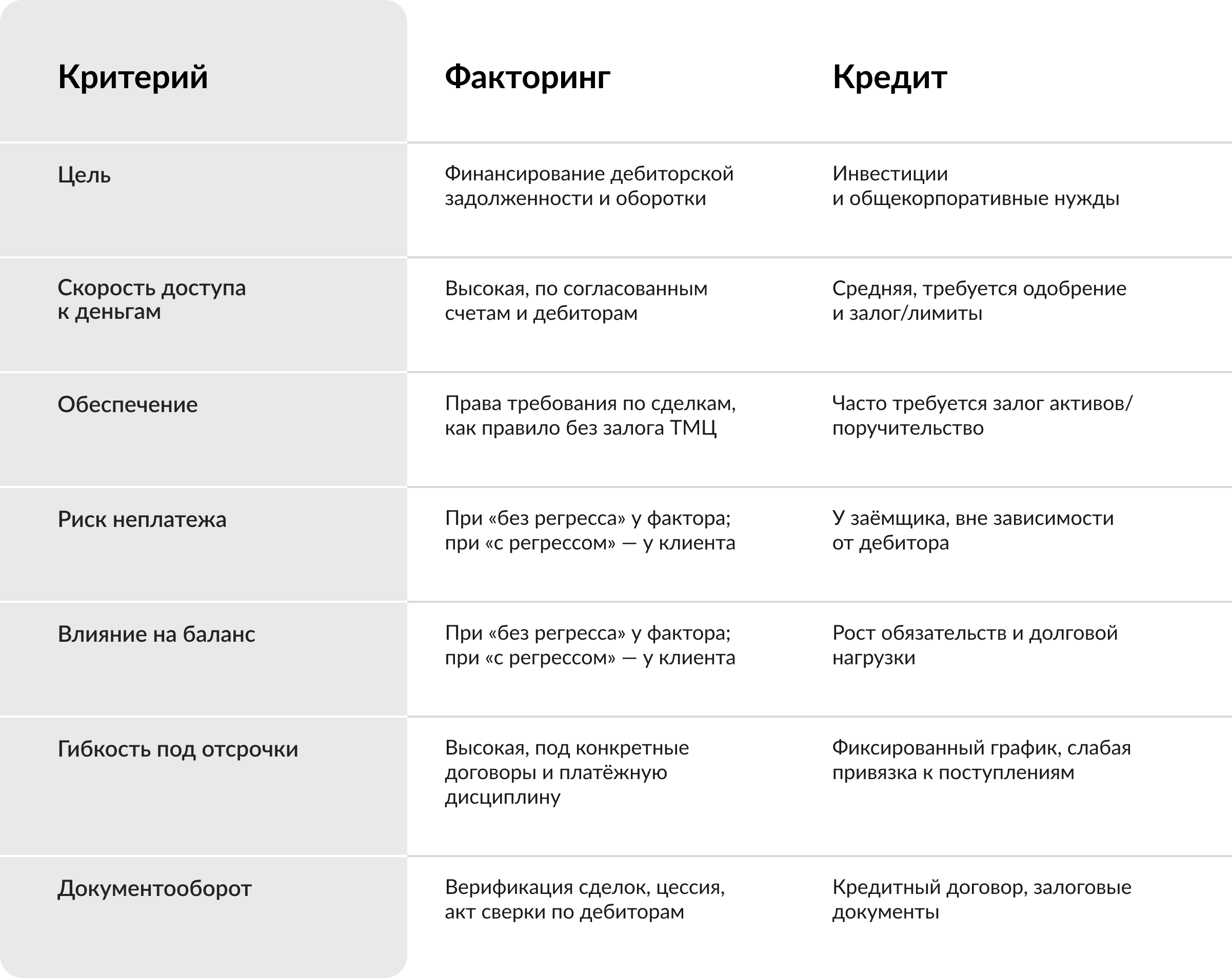 Сравнение кредита и факторинга по ключевым критериям