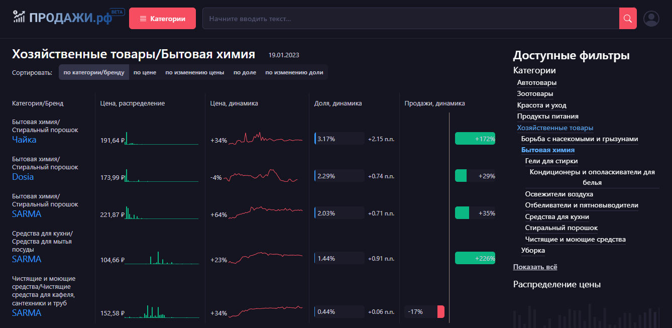 Один из самых оперативных и удобных сервисов аналитики на данный момент — продажи.рф. На сайте представлена актуальная статистика розничных продаж в Российской Федерации. Данные за вчерашний день и общий тренд с 2021 года оформлены в готовые графики. Можно отслеживать актуальные цены и их влияние на продажи, а также узнать, в каких ценовых диапазонах концентрируется большее количество продаж по своему бренду и конкурентам.