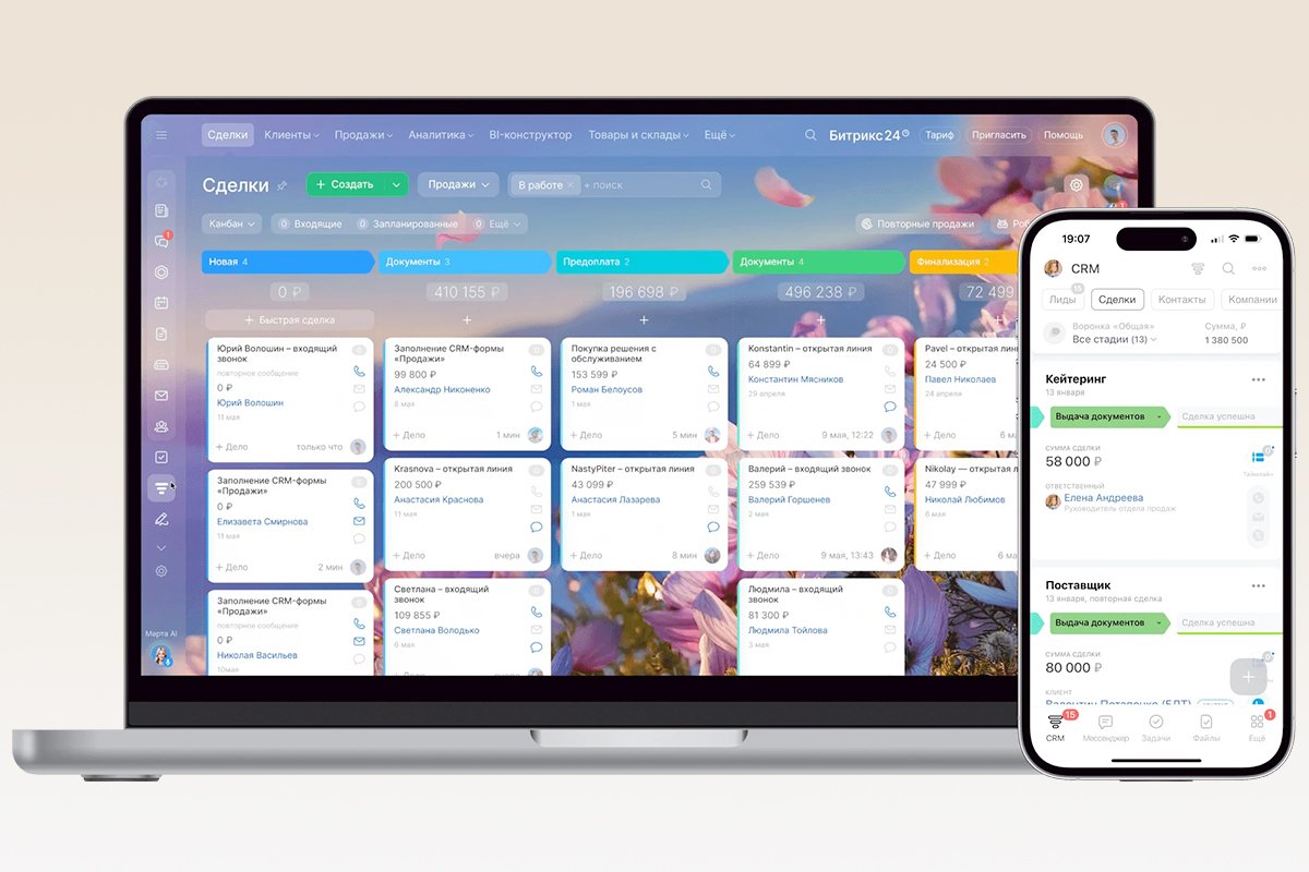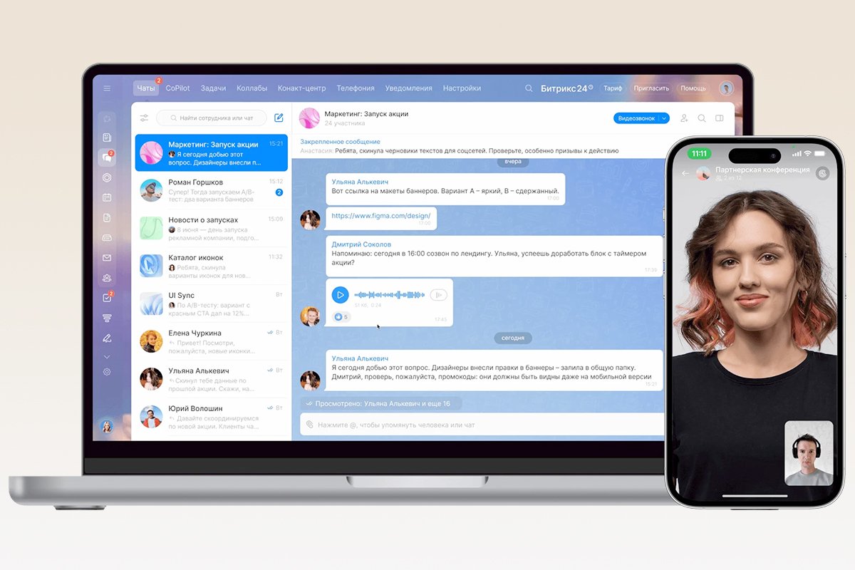 - CRM, задачи, чаты, документы, календарь, автоматизация — все в едином интерфейсе.
